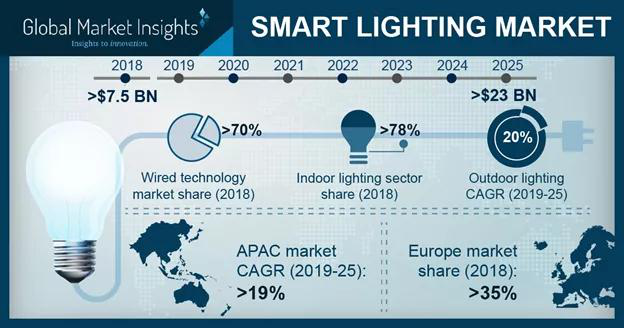 在接下來(lái)的幾年中,智能照明市場(chǎng)預(yù)計(jì)將呈指數(shù)級(jí)增長(zhǎng)。據(jù)市場(chǎng)調(diào)研公司Global Market Insights進(jìn)行的研究非常明顯地表明了這一領(lǐng)域的商業(yè)化市場(chǎng)規(guī)模,該研究稱(chēng),到2025年底,智能照明行業(yè)的市場(chǎng)份額將超過(guò)230億美元的總估值。預(yù)計(jì)從2019年到2025年的復(fù)合年增長(zhǎng)率將超過(guò)15%。
